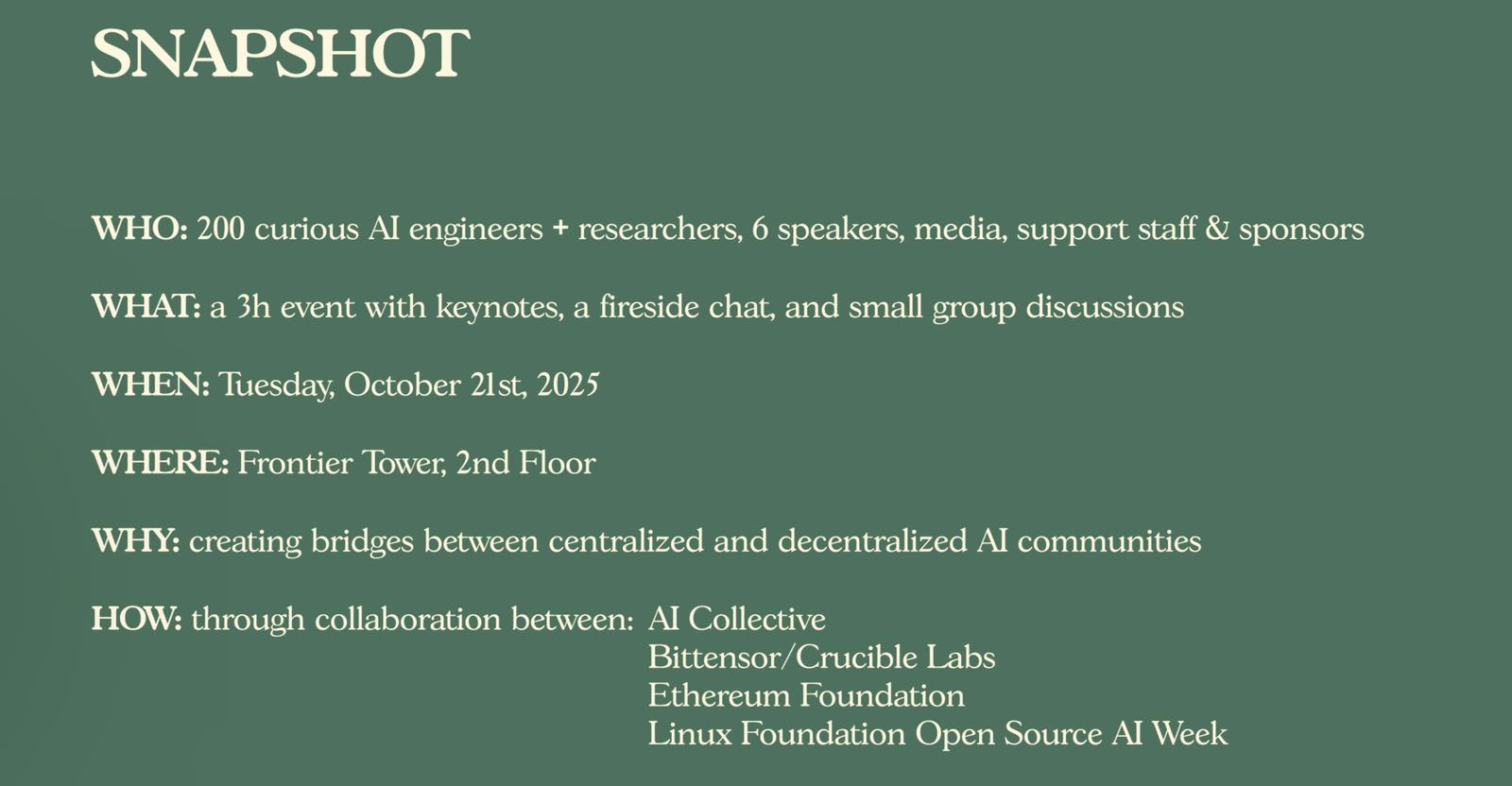 On Tuesday, October 21, the Collective will host an exclusive session at Frontier Tower in San Francisco dedicated to the future of decentralized AI. The event brings together builders, researchers, and investors examining how distributed compute, open-weight ecosystems, and on-chain coordination can reshape model development and governance.