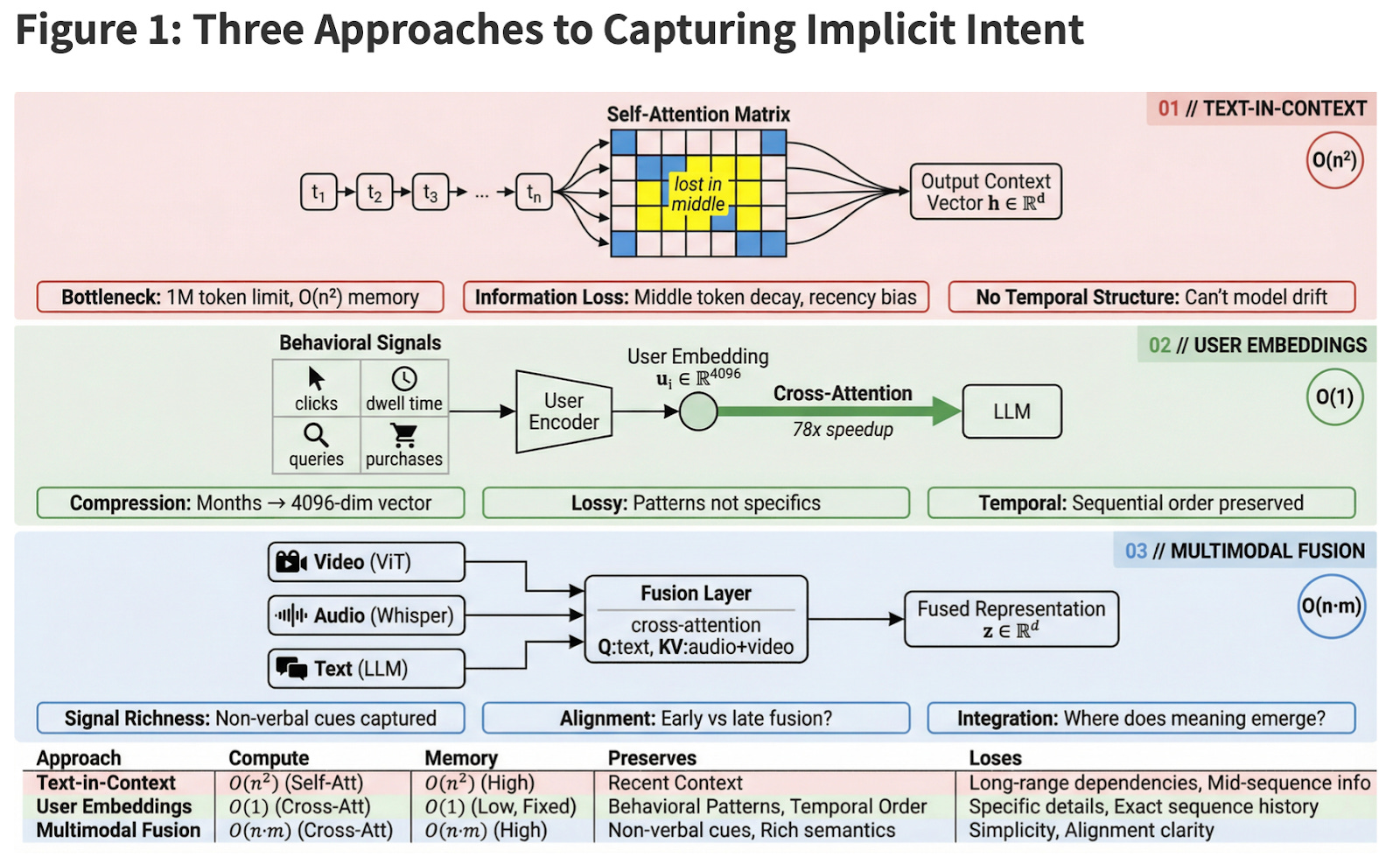 Row 1 (Text-in-Context): Raw conversation history tokens flow through a self-attention mechanism where the âlost in the middleâ phenomenon causes attention decay for middle tokens. The output is a context vector h âRd. Key limitations include context window constraints, information loss due to attention patterns, and a lack of temporal structure to model preference drift.